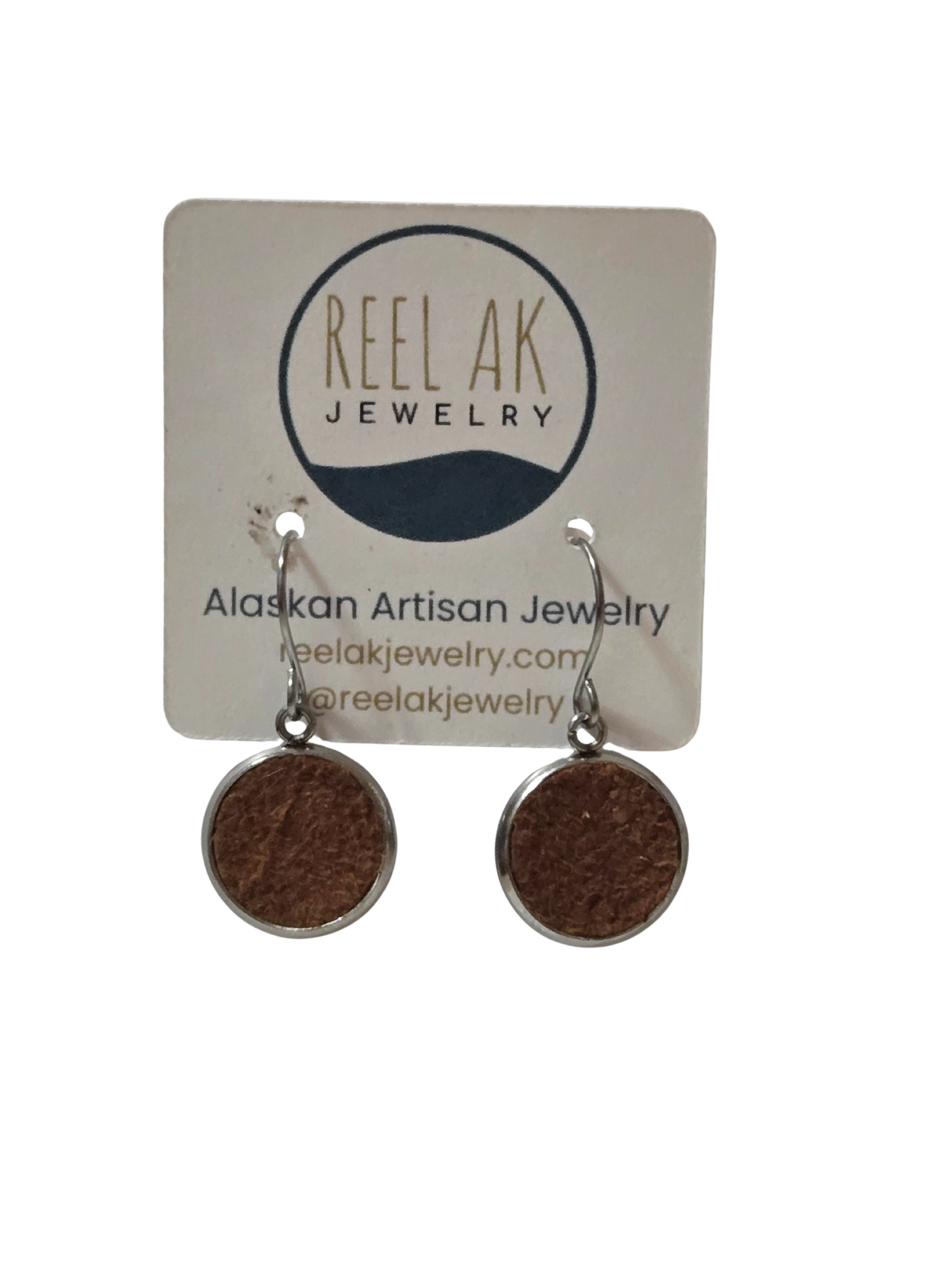 This is our handmade round french hook Caribou Leather earrings, available in multiple sizes: 10mm, 12mm, and 14mm. Each pair features caribou leather in a rich brown tone, inspired by Alaska’s rugged wilderness.